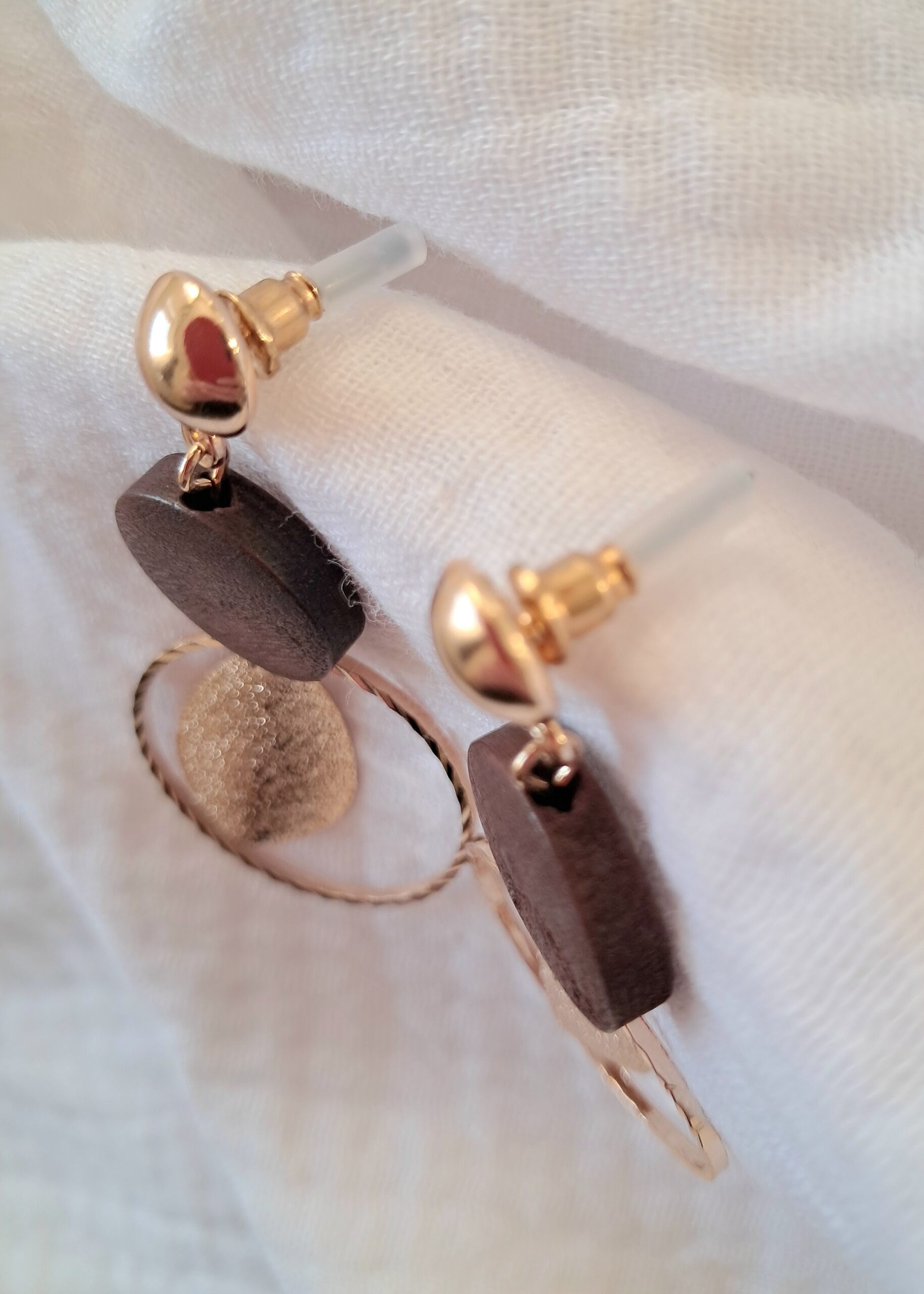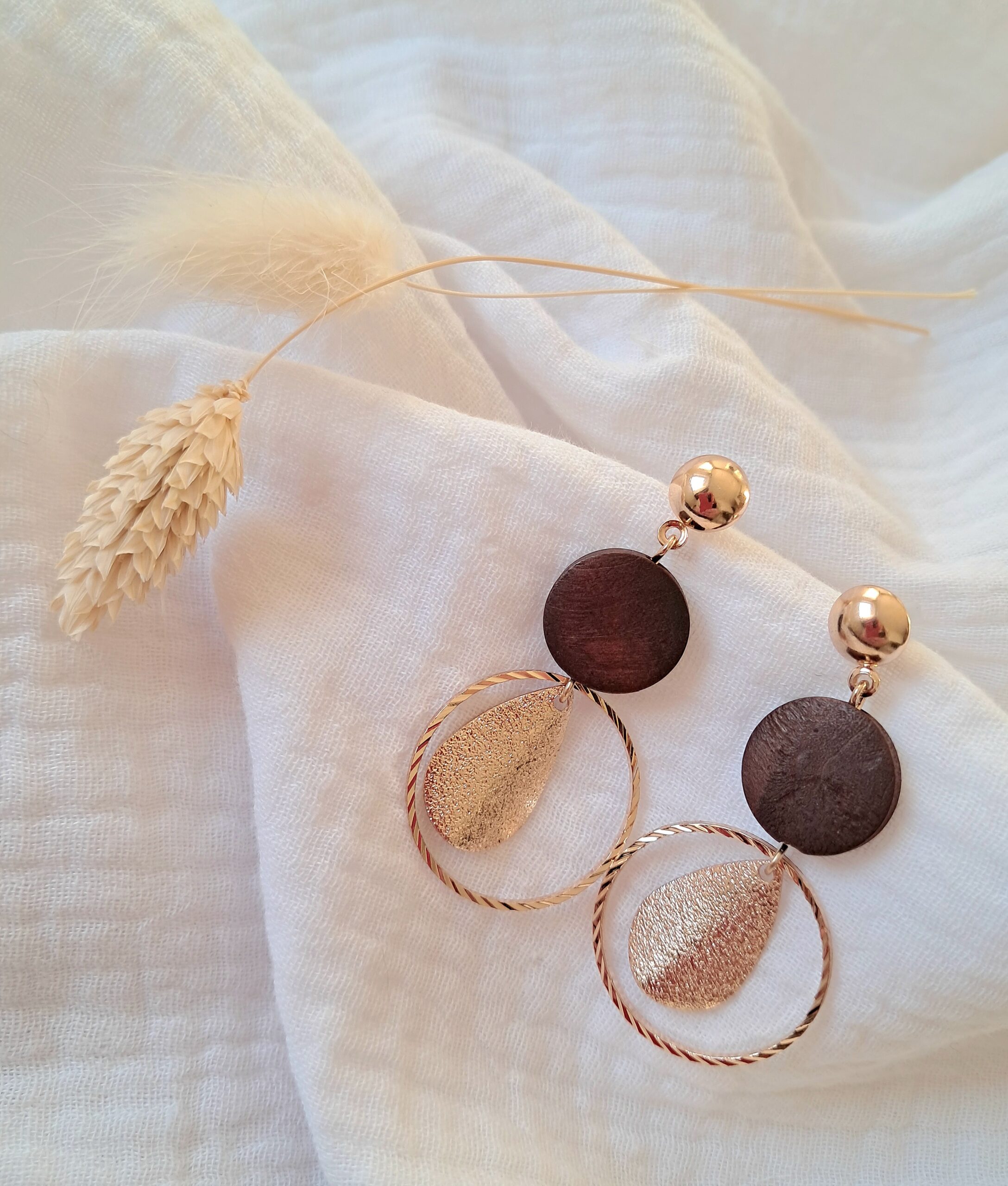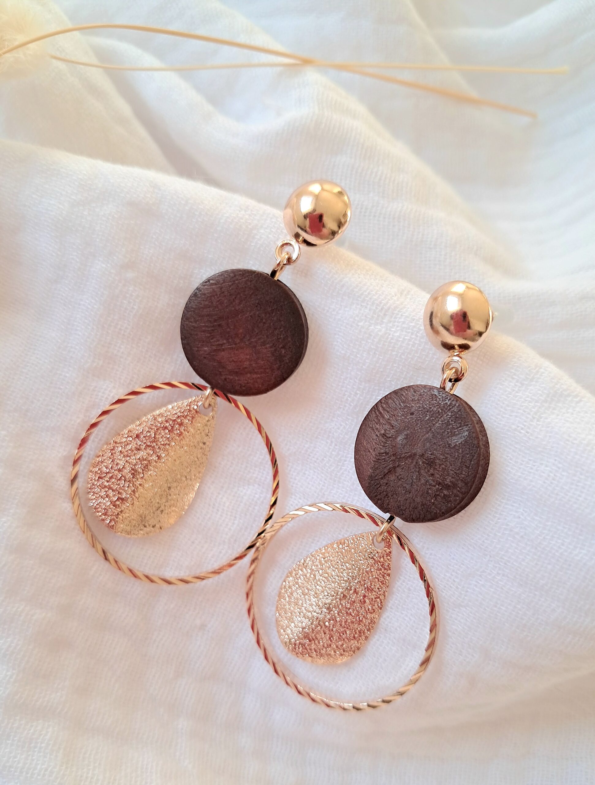 Boucles d’oreilles rondes au style bohème chic, mêlant harmonieusement le bois naturel et le métal/acier doré.