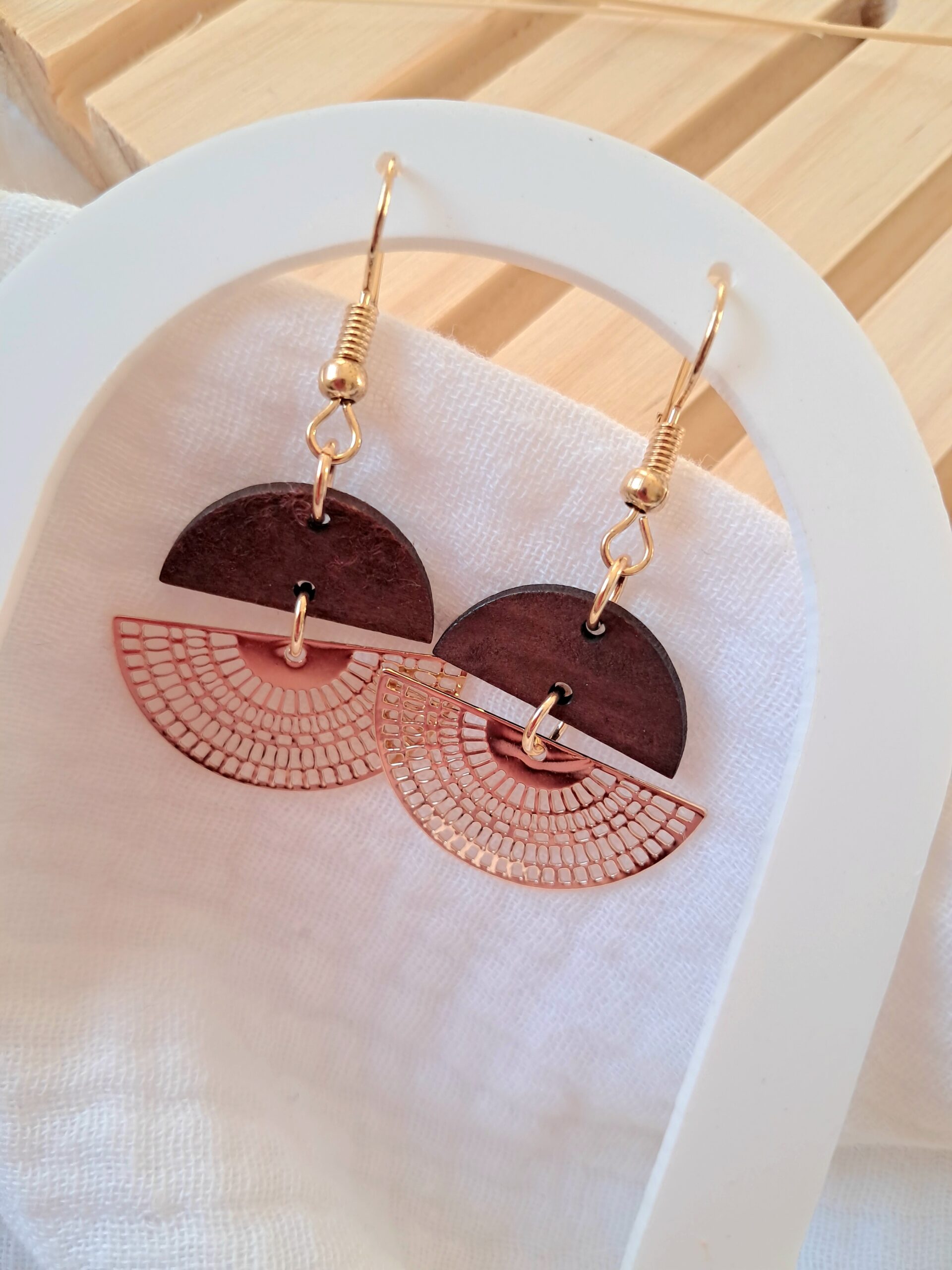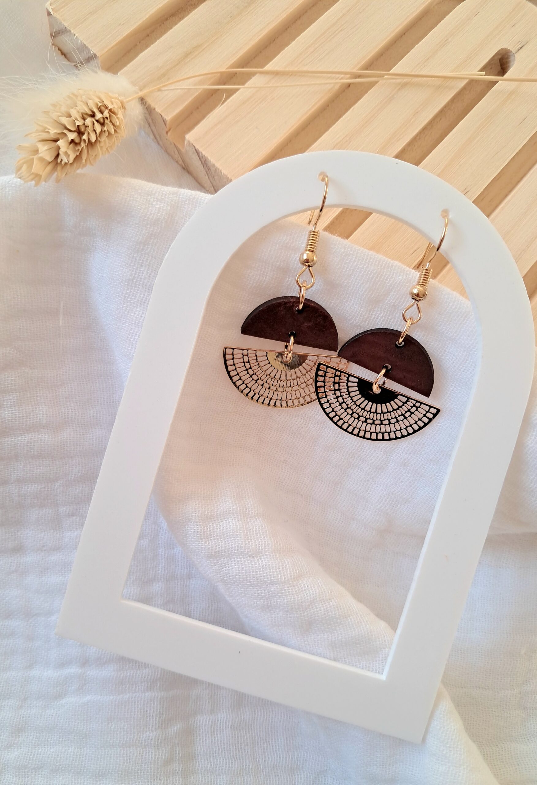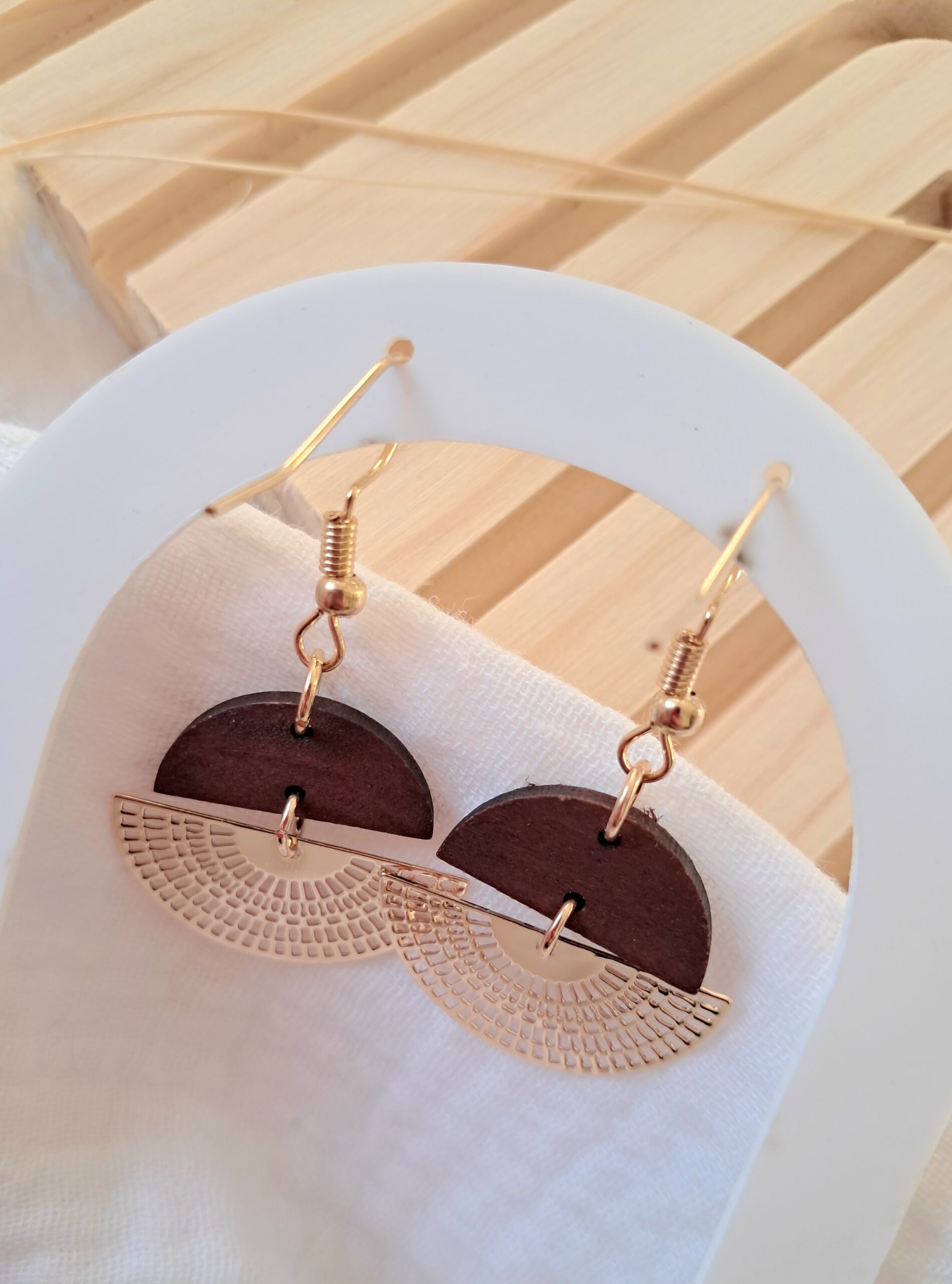 Boucles d’oreilles pendantes en demi-sphère, alliant métal/acier doré et bois marron pour un style naturel et élégant.